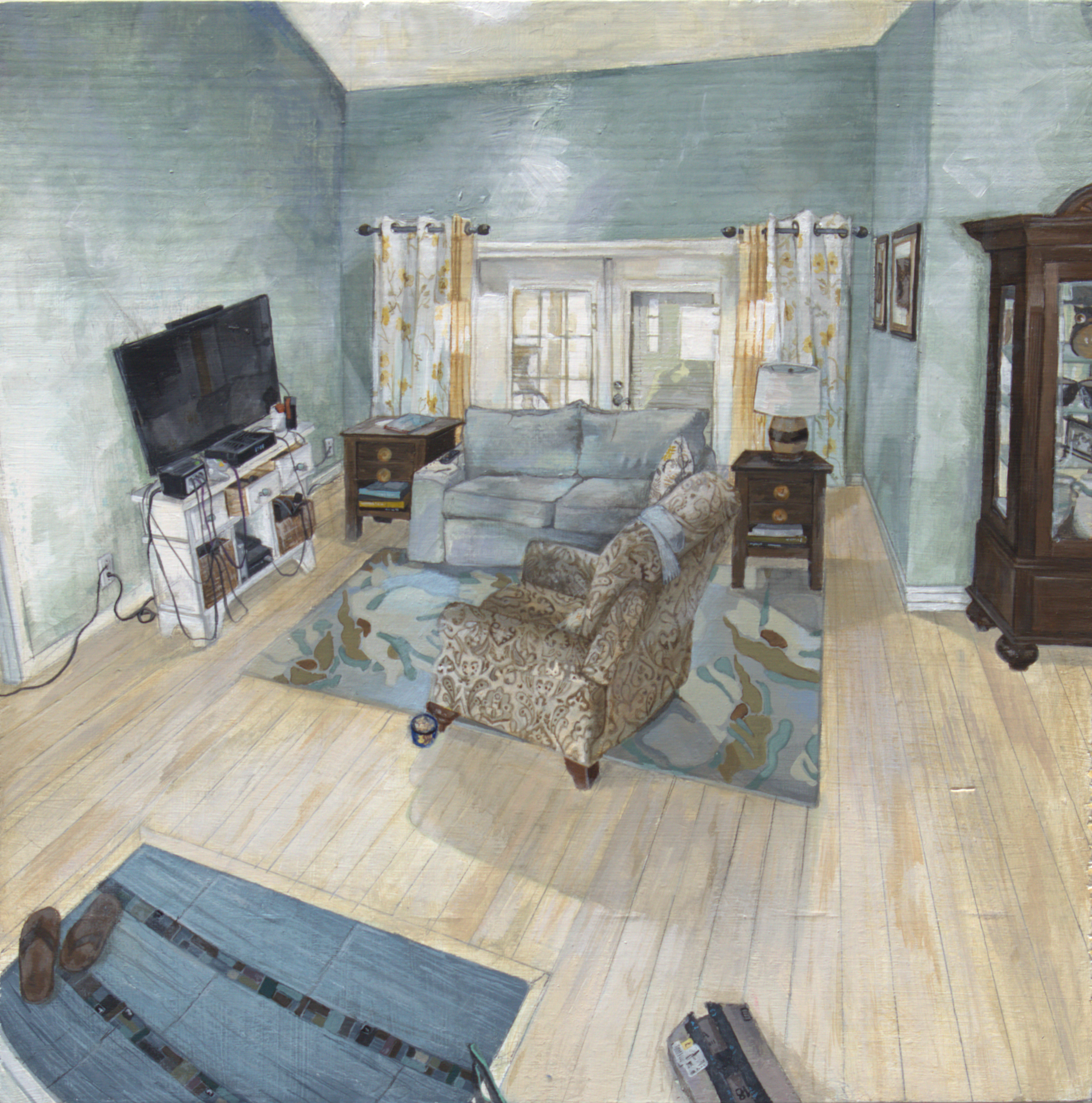 What does it mean to be the idealized nuclear family in America, and is that an attainable reality? I reference my family home in my work to actively question what is unwatched and unguarded in order to remove the veil of public roles like mother, father and child and allow for a deeper truthfulness to emerge. I aim to capture everyday moments of the suburban family home where we operate within and contradict existing social conventions. I use painting to interpret and distort these moments through warped perspective and time which mirror the dissonance of what is expected compared to what is actually there. My intention is to guide the viewer into questioning their own interpersonal dynamics and ultimately discover what their expectations around those relationships reveal about themselves.